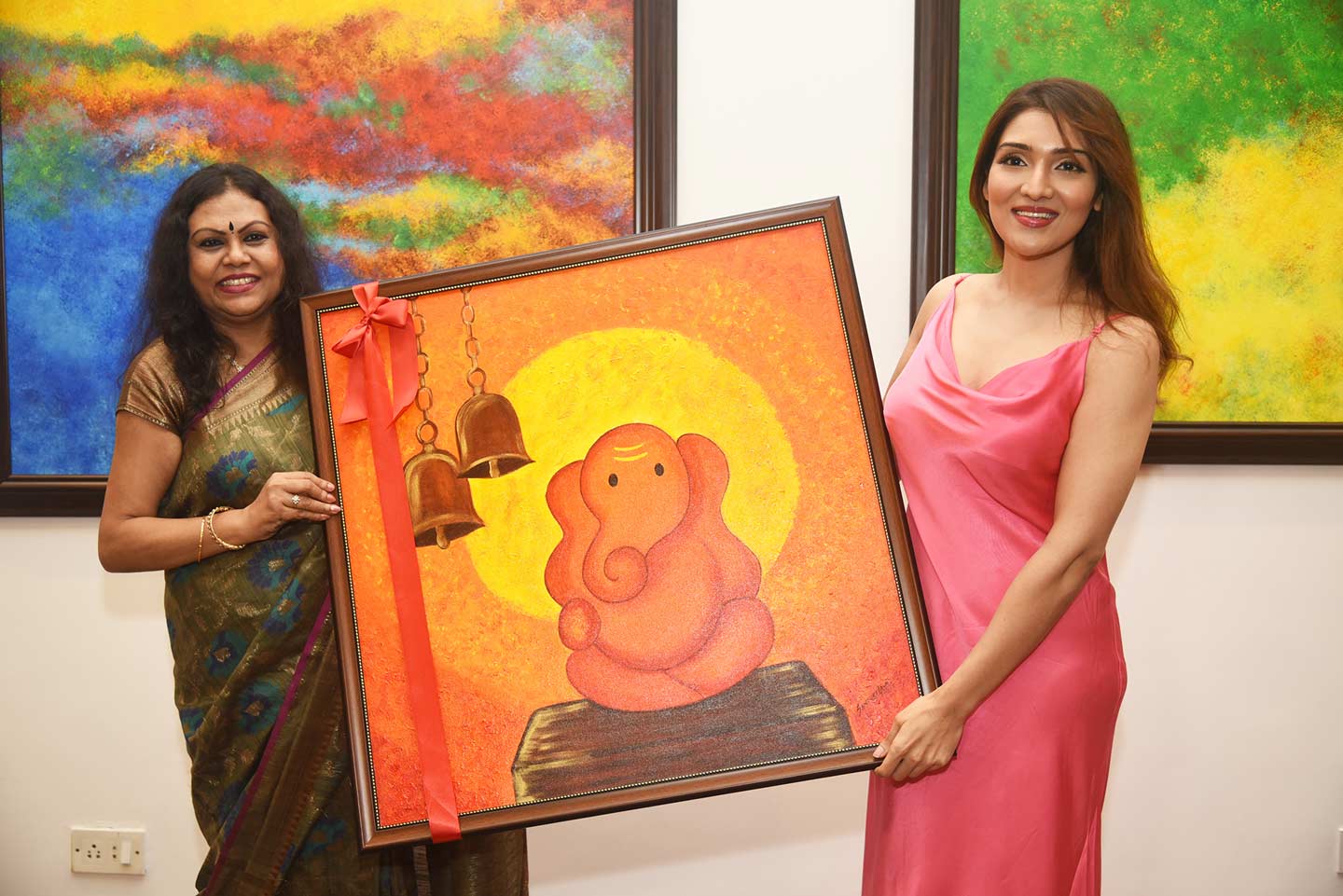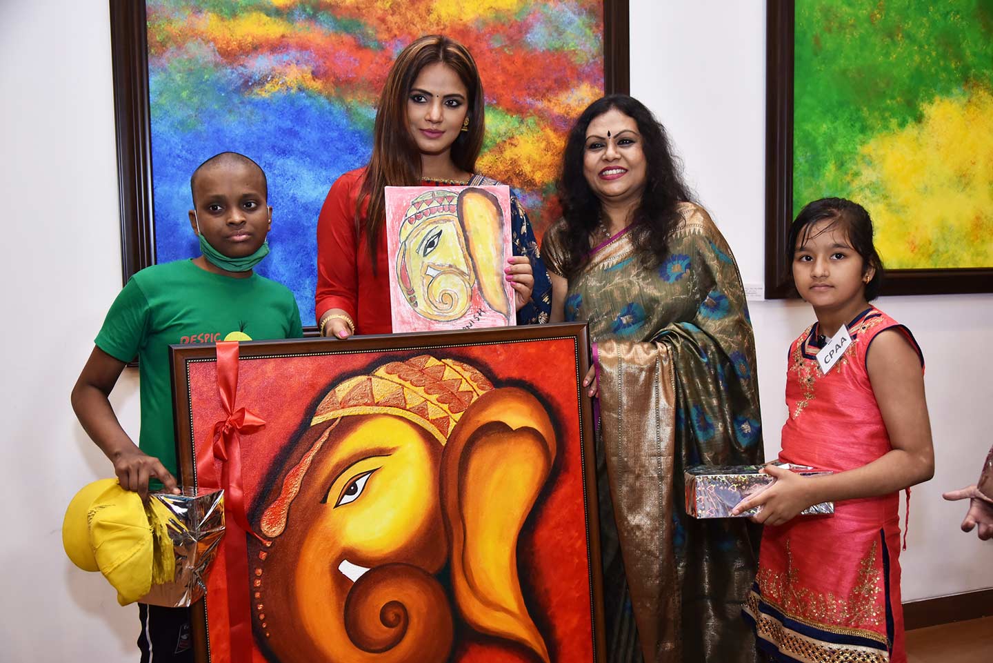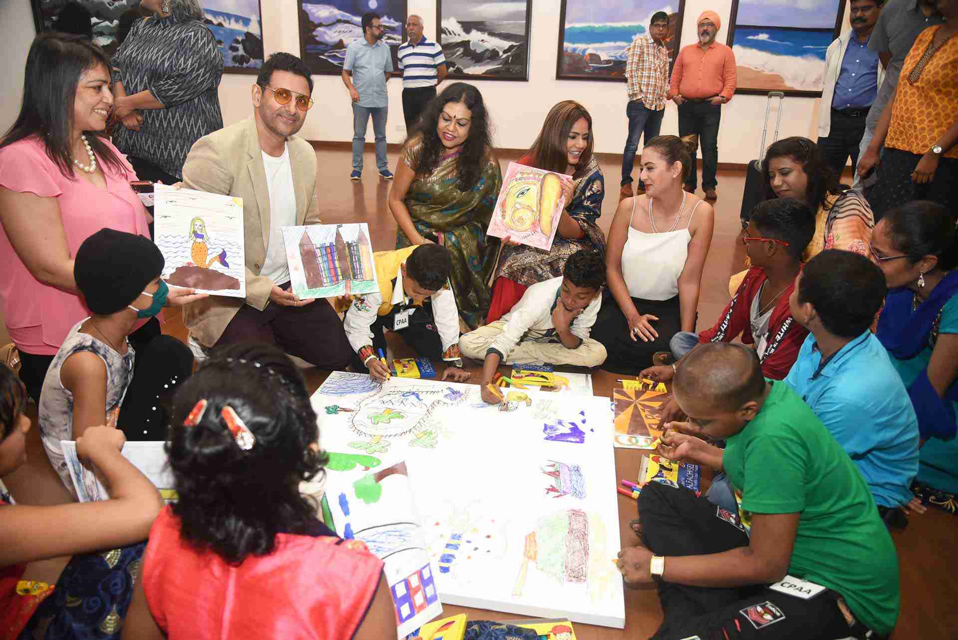 The inauguration of Sanjukta Arun’s show saw a bevy of celebrities and artists who walked in to cheer the noted artist and the children from CPAA. Actors Neetu Chandra, Preeti Jhangiani, Parvin Dabas and Tina Ahuja, Audiologist-Speech Therapist Devangi Dalal, Anita Peter of CPAA, lensman Pradeep Chandra, artists Padmanabh Bendre, Devyani Parikh, Madhusudan Kumar, Ami Patel and Amisha Mehta among others were spotted at the do. Children from CPAA, between the ages of 8 to 14, were involved in a unique workshop, prior to the inauguration, where Sanjukta Arun was seen guiding the brave-hearts on how to unleash their imagination on canvas through sketch and colours. It was a treat to watch the children at work, against a backdrop of 16 large format works by Sanjukta, created with multiple layers of brush strokes, knife work, stippling work and texture. Interestingly, the proceeds from Sangam will go towards the well-being of children from Cancer Patients Aid Association [CPAA].